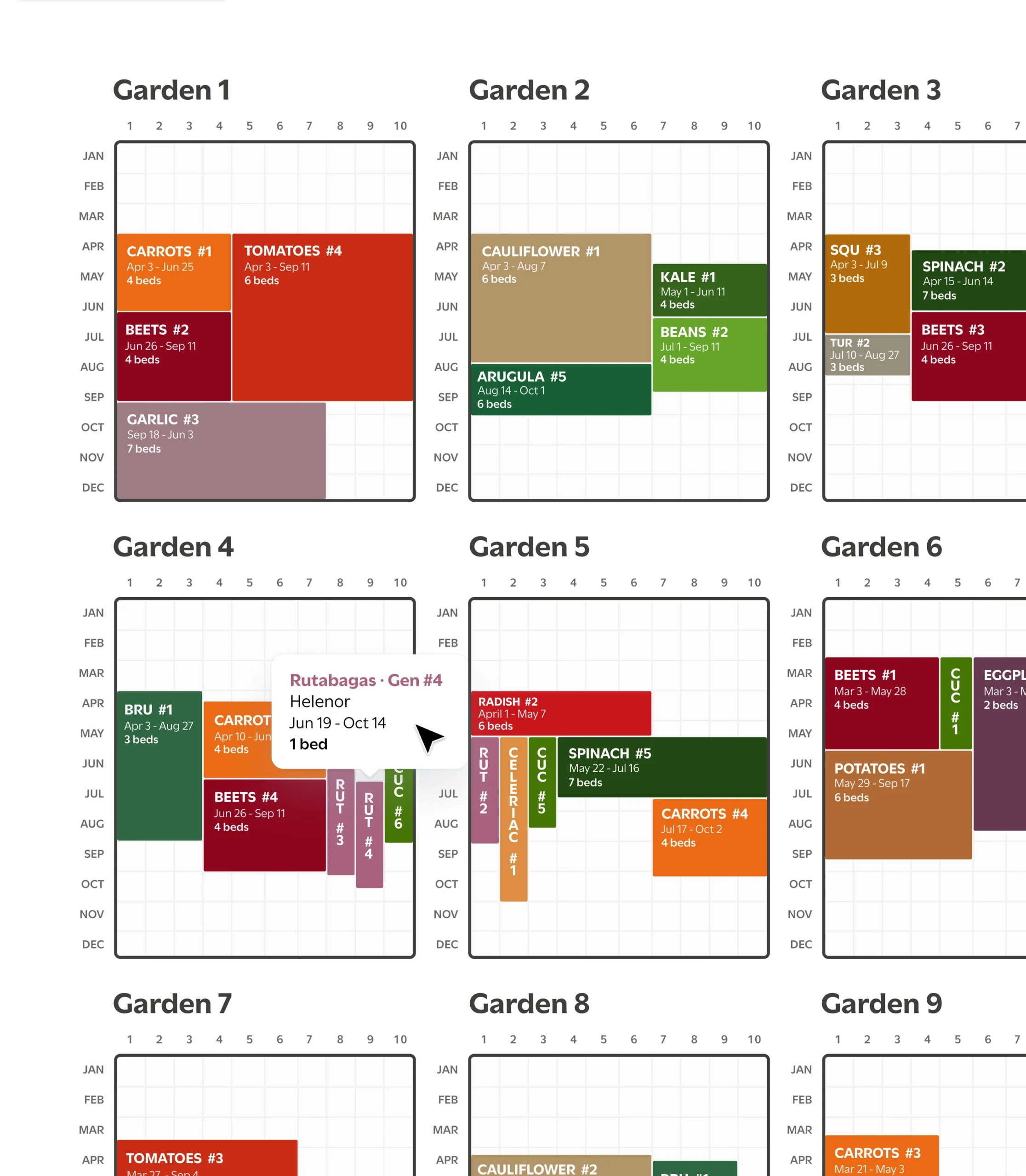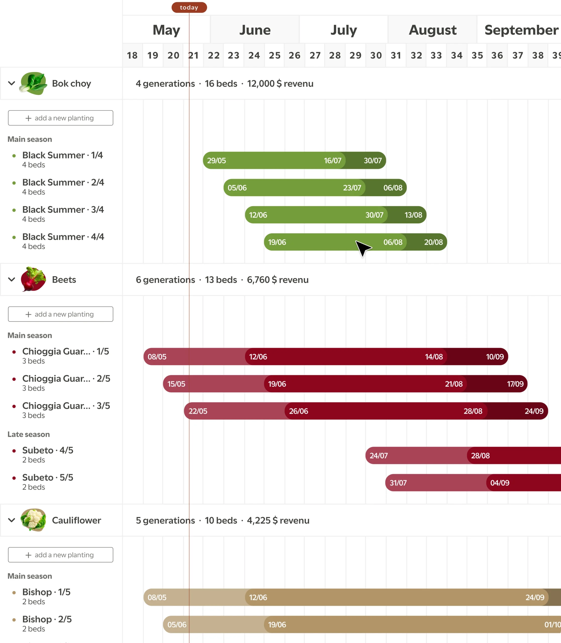 Place your crops in space and time, including successions, and get a clear bird's eye view of the whole season's production and revenue.