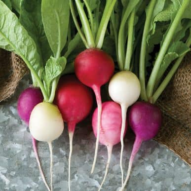 Johnny’s improved version of this favourite! Make beautiful bunches with this mix of red, purple, and white round radishes. Maturing over an extended period of time, they stay crisp and mild even when large. Great fun for children and adults alike. Avg. 10,300/100 grams