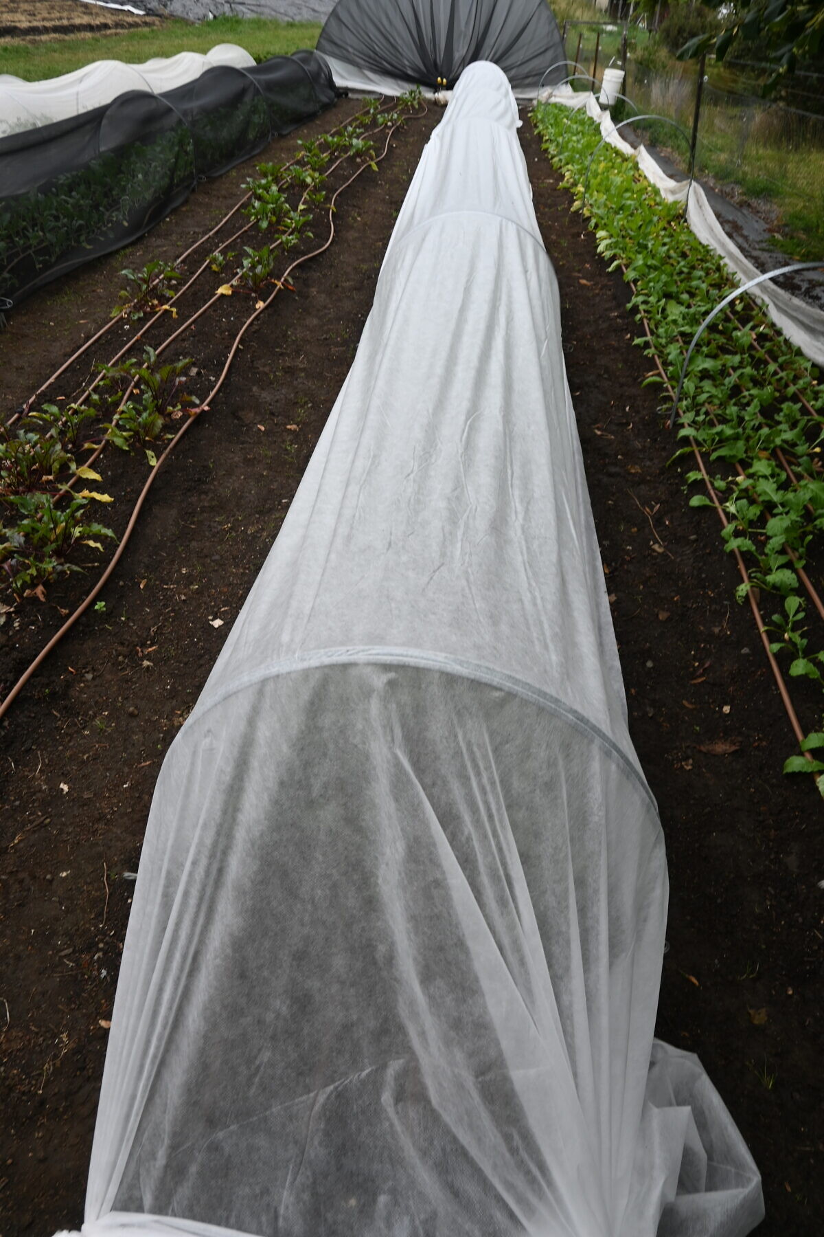 For shorter winter days, plants need to maximise available light. Using 30gsm as as default cover takes the edge off radiative frost, especially over low, close-to-soil crops (salads, brassicas, herbs). Daily venting is still suggested.