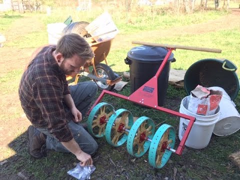 Can be set up for in-row plant spacings of 75mm, 10cm, 15cm, 20cm, 30cm, 38cm, ,56cm, or 104cm. Spare dibbles store right on the wheel. Moisture-resistant wooden, CNC machined wheels coated with linseed oil. 50mm wide plastic outer wheel. Oiled ashwood and red powder-coat on steel construction. Completely adjustable for many different crop types. Wheels clamp securely in any position on the same axle for almost infinite adjustment up to the maximum width, including offset planting. Includes 95cm wide frame and one handle for one-person operation