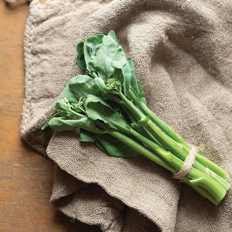 Spears are tender and sweet, developing a mustardy flavour as they mature. Although transplanting is recommended, it performs better direct-seeded and at tighter spacing than many mini broccoli varieties (4–6″ in-row). Can be 1–2 weeks earlier than Happy Rich, but less heat tolerant and with a shorter harvest period. This Chinese specialty (also known as Kailaan or Chinese kale) can be sold loose or in bunches. Avg. 107,200 seeds/lb. Packet: 500 seeds.
