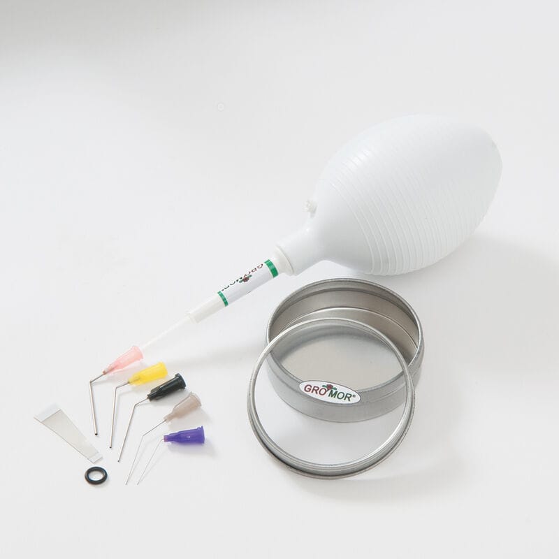 Five stainless-steel-tipped nozzle attachments are included, each colour-coded for a different range of seed sizes, and a magnifier attachment that can be slipped over the nozzle to help locate tiny seeds.