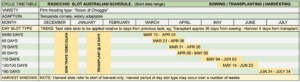 Selection Cycles (days to maturity slots). For most vegetables growers stagger planting dates to provides a continuous harvest. With radicchio, a different strategy is employed. For most, heading radicchio is best suited to seeding around the summer solstice, Dec 21st to Jan 3rd, transplanting 3-4 weeks later. To achieve extended harvest periods, rather than staggering planting dates, radicchio uses days-to-maturity options within a type. These are often referred to as “slots” with many types having early, mid, and late slotted varieties