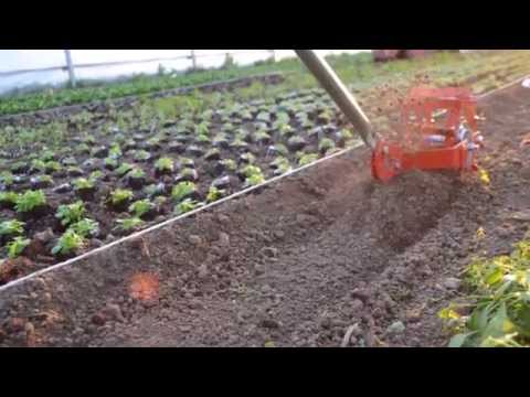 This wheel hoe, which originated in Belgian Flanders, is a very useful tool for weeding during the early stages (filament/cotyledon)