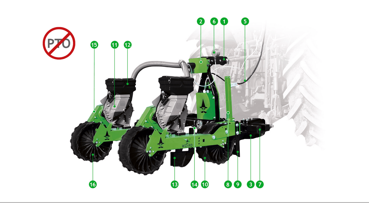 - The 12V vacuum fan allows you to apply this series of seeders to any type of tractor or tool-carrier without the need for a PTO connection or an applied hydraulic motor.