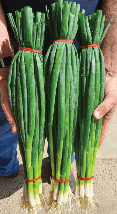 - Spring onions are harvested with their tops and bunched in the fields in a kneeled position.